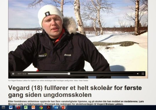 Vegard Brataas Løkken (18) fra Oppland fullfører et helt skoleår for første gang siden ungdomsskolen – på Pasvik folkehøgskole. Se NRK-nordnytts intervju med Vegard og rektor Ketil Foss ved Pasvik folkehøgskole. …
